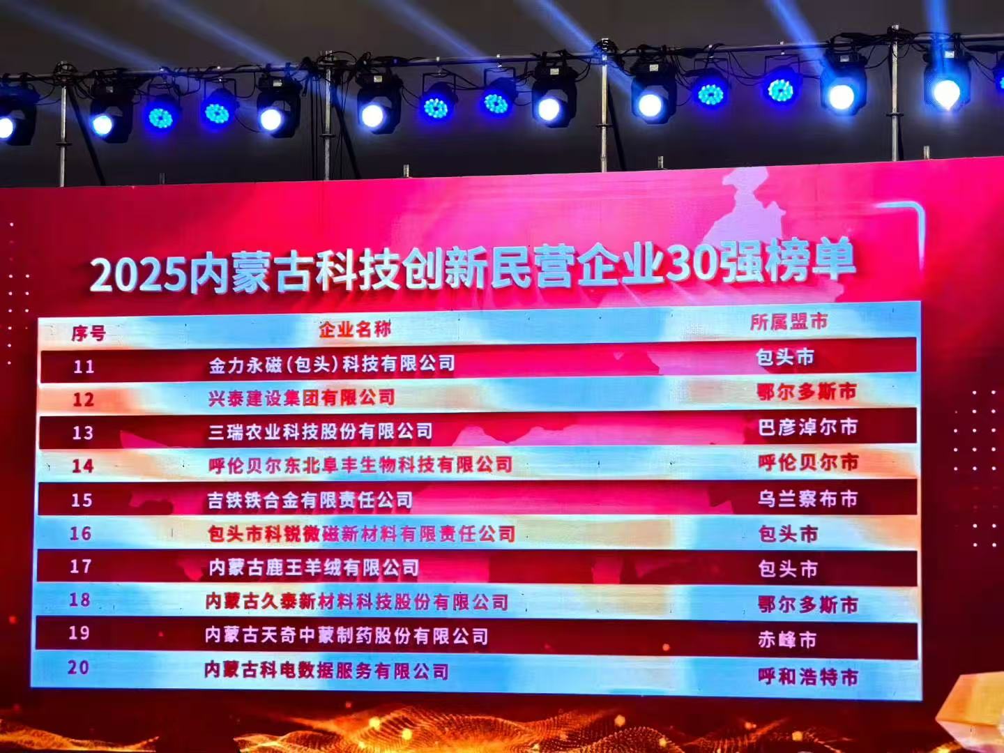 7月17日,2025内蒙古民营企业100强发布会在赤峰市举行。会上,“2025内蒙古民营企业100强”、“制造业民营企业50强”、“服务业民营企业20强”、“科技创新民营企业30强”系列榜单正式发布。内蒙古科电数据服务有限公司被自治区工商联、自治区科技厅、自治区民营经济发展服务局评定为“2025内蒙古科技创新民营企业30强”,在30强榜单的IT公司中位列第一!科电数据公司总裁曹玲作为企业代表,受邀上台接授奖牌。